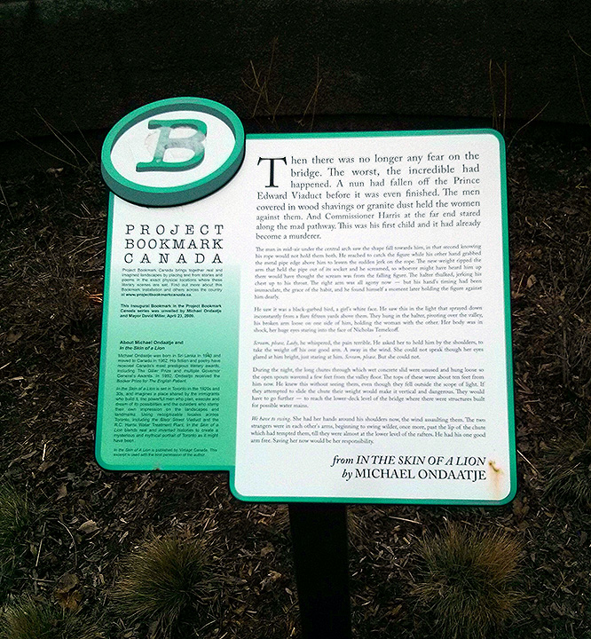 Project Bookmark is a unique project that takes passages from fiction and situates them in the real world. In this example, located at the eastern edge of the Prince Edward or Bloor viaduct, an early passage from Michael Ondaatje's In the Skin of the Lion describes a nun being swept off the bridge by the wind. It's a scene, and a book, deeply rooted in place. Readers of this plaque can take a few steps and experience the bridge for themselves, take in its height and be exposed to the elements. Combining the fiction and the reality in this way increases one's appreciation of both. It was an excellent choice with which to launch the program. To date, 15 bookmarks have been placed across Canada, and the 16th will be unveiled in Hamilton on June 10.
